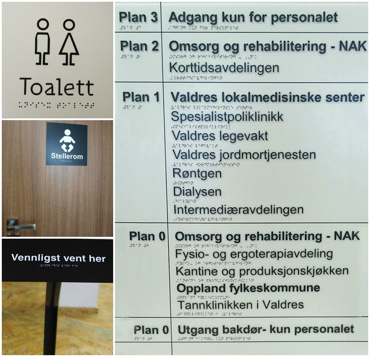 Realizacja obejmuje brajlowskie tabliczki z tworzywa z opisami pomieszczeń dla kontrahenta w Norwegii. Są to tabliczki na drzwi i na ściany, z opisami w czarnym druku i w brajlu. Część z nich jest biała z czarnymi napisami, część czarna z białymi napisami.