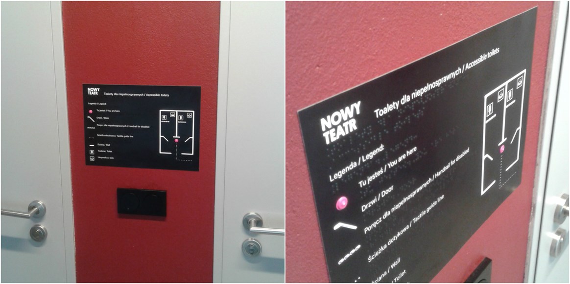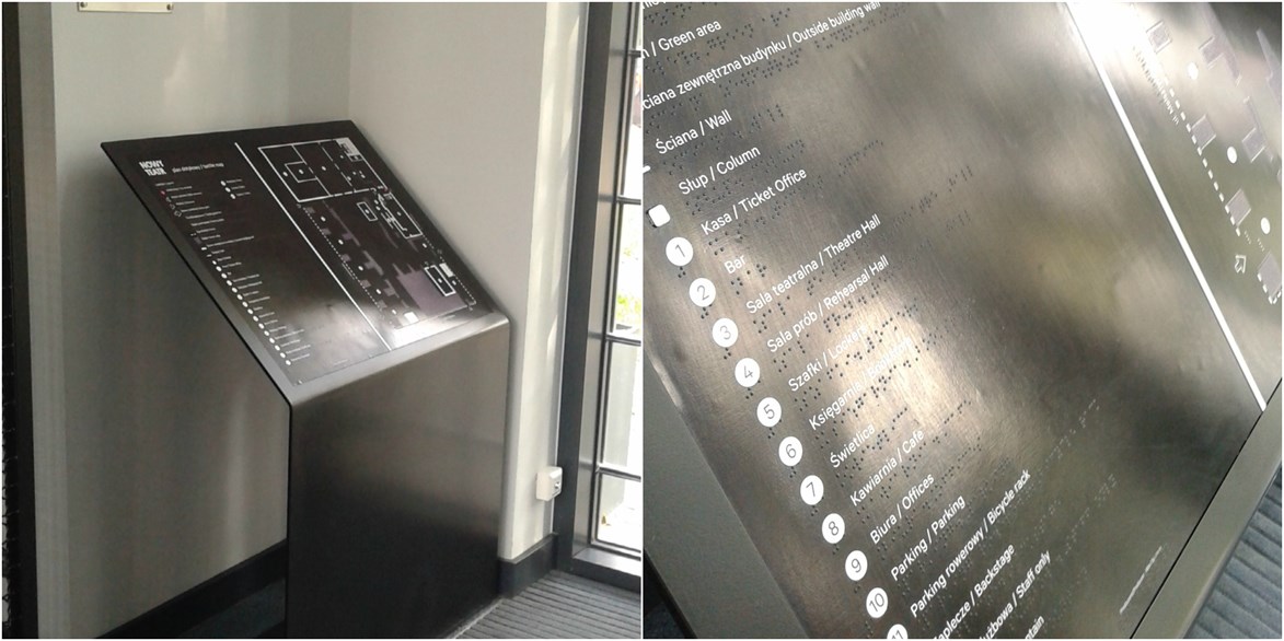 Realizacja obejmuje niezwykle estetyczny i elegancki, dotykowy plan informacyjny obiektu i dotykowe plany informacyjne toalety dla osób niepełnosprawnych w budynku Nowego Teatru w Warszawie. Ergonomicznie pochylona tablica z dotykowym planem informacyjnym budynku umieszczona jest na stojaku z chromowanej stali w kolorze ciemnografitowym. Stojak stanowi jedną całość z tablicą. Plan usytuowany jest z prawej strony tablicy, zaś legenda z lewej jej strony. Biały obrys planu znajduje się na czarnym tle, podobnie legenda – białe litery na czarnym tle. Legenda jest ponadto opisana w brajlu. W tej samej kolorystyce utrzymana jest tablica z planem informacyjnym toalety dla osób niepełnosprawnych. Jedynym odstępstwem jest amarantowy element „Tu jesteś”. Plan toalety umieszczony jest na jej drzwiach, w pionie i został opatrzony legendą.