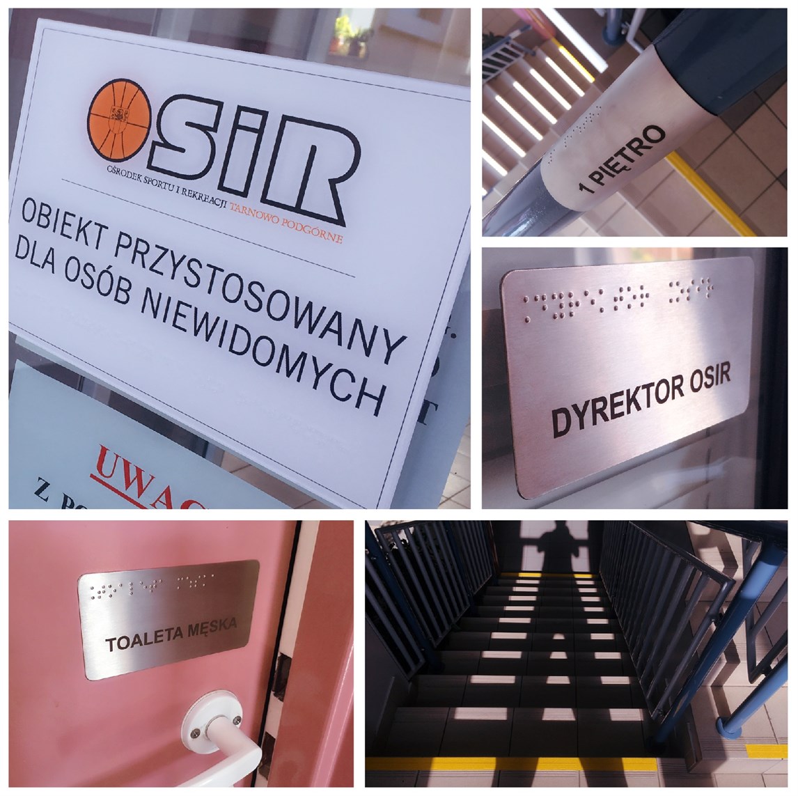 Realizacja obejmuje informacyjne tabliczki brajlowskie na drzwi, brajlowskie nakładki na poręcze schodów i oznakowanie schodów w budynku Ośrodka Sportu i Rekreacji w Tarnowie Podgórnym. Metalowymi tabliczkami brajlowskimi oznaczone są miejsca istotne z punktu widzenia odwiedzającego obiekt, m.in. gabinet dyrektora placówki czy też toalety. Metalowe, brajlowskie nakładki na poręcze informują np. o tym, na którym piętrze znajduje się odwiedzający OSiR. Ostatnim elementem realizacji jest poziome oznakowanie schodów kontrastowymi, żółtymi pasami.