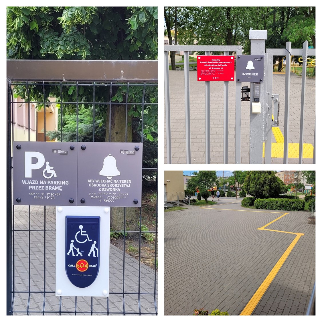 Realizacja w budynku Ośrodka Wsparcia i Testów w Bydgoszczy obejmuje 16 informacyjnych tabliczek w czarnym druku i w brajlu, z piktogramami, wewnątrz i na zewnątrz obiektu, metalową nakładkę brajlowską na poręcz schodów, 130 metrów bieżących żółtych, kontrastowych linii naprowadzających na zewnątrz budynku, a także kontrastowe pola uwagi. W skład realizacji wchodzi ponadto system przywoławczy Call-Hear.