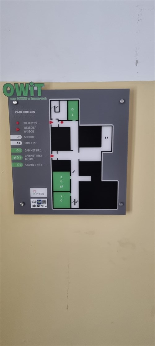 Realizacja w budynku Ośrodka Wsparcia i Testów przy Specjalnym Ośrodku Szkolno-Wychowawczym w Ropczycach obejmuje dotykowy plan informacyjny obiektu ze znacznikami YourWay Beacon i NFC, a także informacyjne tabliczki na drzwi w czarnym druku i w brajlu. Dotykowy plan informacyjny został umieszczony w pionie, na ścianie, na dystansach. Ma postać tablicy wykonanej z tworzywa PMMA. Jego kolorystyka to szarość, czerń, biel i zieleń. Plan jest opatrzony legendą w czarnym druku i w brajlu, posiada ponadto wspomniane już znaczniki. Informacyjne tabliczki na drzwi utrzymane są w biało-granatowej kolorystyce.