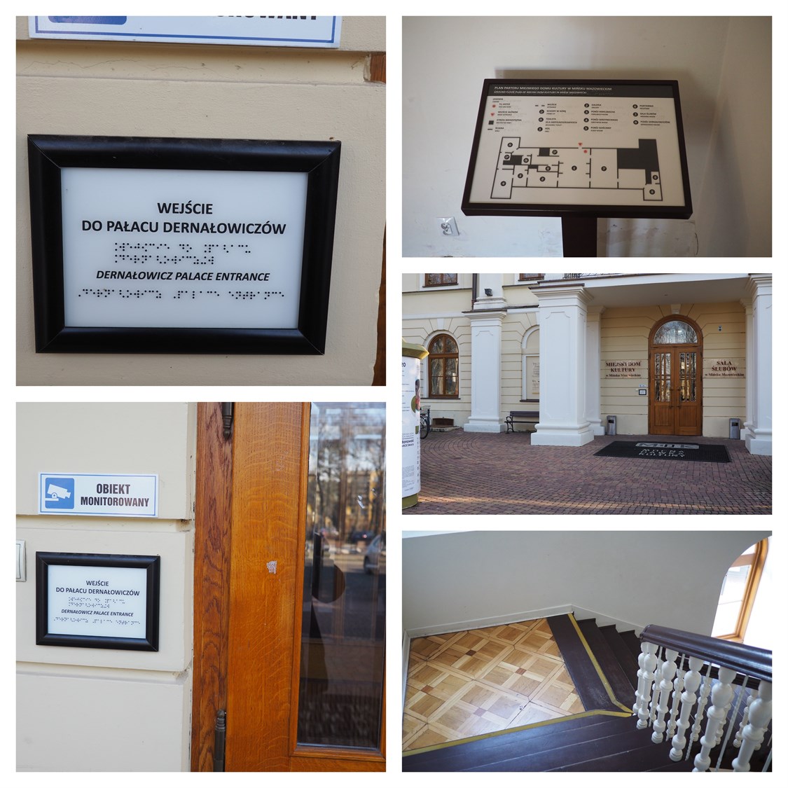 Trzy dotykowe, wypukłe plany Pałacu Dernałowiczów i Miejskiego Domu Kultury w Mińsku Mazowieckim mają postać tablic o stonowanych kolorach, korespondujących z kolorystyką wnętrz. Zostały wykonane w technice odlewu żywicznego, odpornego na zadrapania i uszkodzenia. Tablice umieszczone są na każdym piętrze, wzdłuż ciągu komunikacyjnego klatki schodowej i prezentują plany w perspektywie zależnej od tego, gdzie się znajdują. Ułożone są poziomo i są ergonomicznie pochylone w kierunku osoby odwiedzającej obiekt. Zamontowane są na stalowych stojakach, malowanych proszkowo. Plan usytuowany jest na każdej z tablic centralnie. Nad każdym z nich widoczna jest brajlowska i czarnodrukowa legenda. Realizacja obejmuje ponadto trójwymiarową, metalową, odlewaną makietę pałacu, znajdującą się przed wejściem do obiektu. Umieszczona jest na postumencie, poziomo. Ergonomicznie pochylenie ułatwia jej oglądanie. Realizacja obejmuje też informacyjne tabliczki z PMMA na ściany. Znajdują się na nich brajlowskie napisy z czarnodrukowym poddrukiem. Ostatnia składowa realizacji to kontrastowa kolorystycznie taśma, umieszczona na pierwszym i ostatnim stopniu schodów, na każdym półpiętrze, na trzech klatkach schodowych.