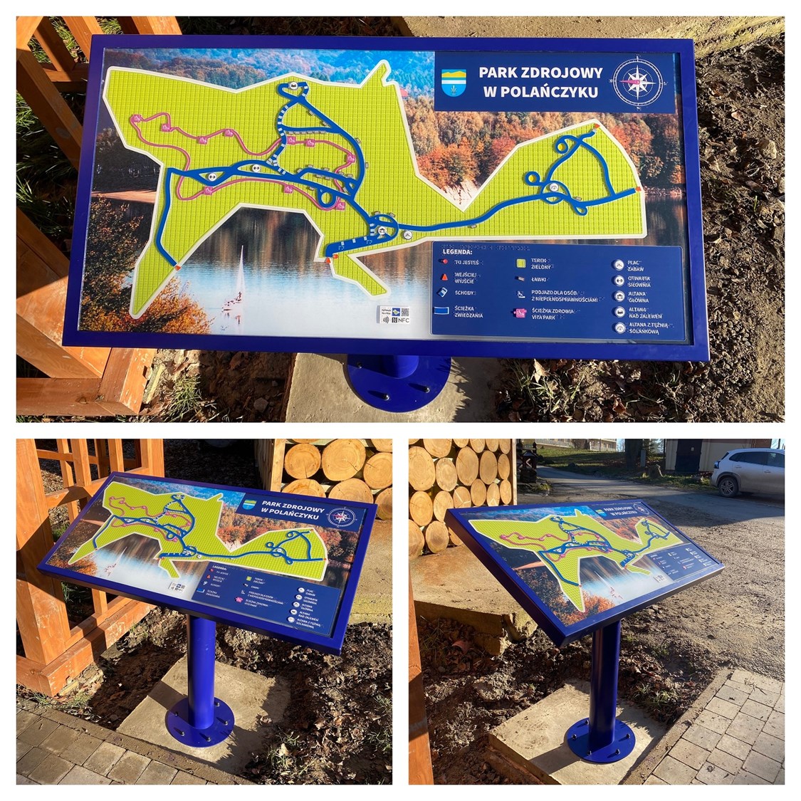 Duży, dotykowy plan informacyjny dokładnie opisuje topografię parku. Ma postać tablicy z tworzywa PMMA, umieszczonej na ergonomicznie pochylonym stojaku ze stali malowanej proszkowo na kolor kobaltowy. Plan utrzymany jest w żywej kolorystyce, korespondującej z naturalnym otoczeniem. Jego tło stanowi zdjęcie Jeziora Solińskiego z brzegami w jesiennej szacie. Na to tło nałożone są dotykowe elementy topografii parku w kolorach żółtym, niebieskim i różowym. Na tablicy znajduje się dotykowa legenda w czarnym druku i w brajlu, a także wspomniane już znaczniki. Całość charakteryzuje się niezwykłą estetyką.