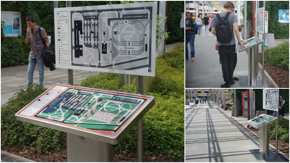 Dotykowy, udźwiękowiony plan pętli komunikacyjnej Młociny w Warszawie ma postać ergonomicznie pochylonej tablicy, usytuowanej na szerokim postumencie z chromowanej stali. Udźwiękowiona legenda, opisana ponadto w czarnym druku i w brajlu, znajduje się z lewej strony tablicy. Większą jej część zajmuje sam plan, utrzymany w stonowanej kolorystyce – zieleń, szarość i biel. Po wciśnięciu przycisku przechodzień uzyskuje głosową informację, adekwatną do obiektu odpowiadającego przyciskowi.