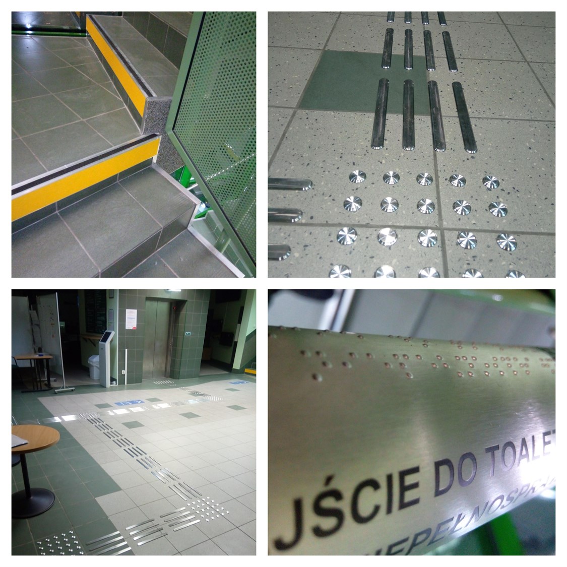 Realizacja obejmuje metalowe nakładki na poręcze z informacjami w brajlu, aluminiowe oznaczenia schodów, stalowe linie naprowadzające i pola uwagi w Powiatowym Urzędzie Pracy w Gdyni.