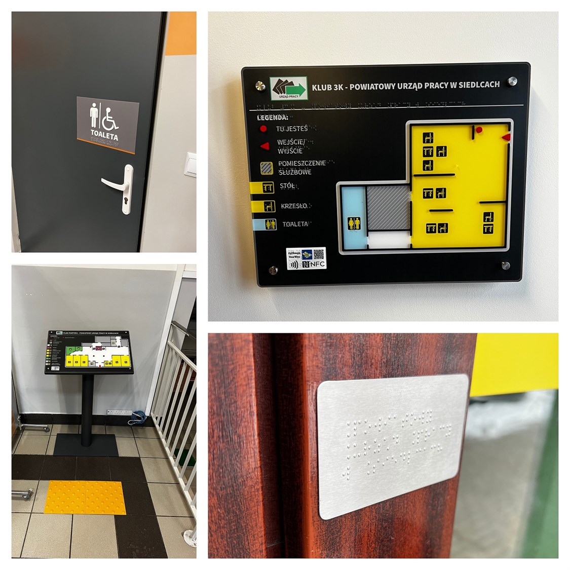 W Powiatowym Urzędzie Pracy w Siedlcach wykonano 5 dotykowych planów informacyjnych ze znacznikami YourWay Beacon i NFC, 32 metalowe tabliczki informacyjne w brajlu, 2 tabliczki informacyjne w czarnym druku i w brajlu, a także pola uwagi przed planami informacyjnymi.