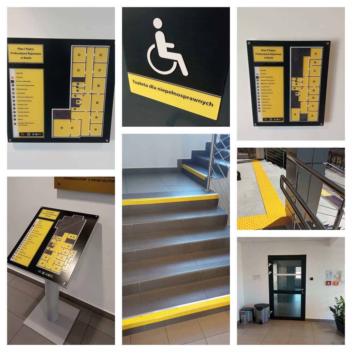 W ramach realizacji wykonano trzy dotykowe plany informacyjne z tworzywa PMMA ze znacznikami YourWay Beacon i NFC, brajlowskie i czarnodrukowe tabliczki informacyjne z tego samego tworzywa, brajlowskie nakładki na poręcze schodów, kontrastowe oznakowanie schodów, linie naprowadzające i pola uwagi w budynku i przed budynkiem Prokuratury Rejonowej w Iławie. Dotykowe plany informacyjne utrzymane są w jednolitej kolorystyce – czerń, kolor żółty, biel i szarość. Mają postać tablic opatrzonych legendami w czarnym druku i w brajlu i wyposażonych we wspomniane już znaczniki. Plan parteru usytuowany jest na ergonomicznie pochylonym stojaku ze stali malowanej proszkowo na kolor szary. Plany piętra pierwszego i drugiego zostały umieszczone na ścianach, w pionie, na dystansach. Realizację dopełniają tabliczki informacyjne w brajlu i w czarnym druku, brajlowskie nakładki informacyjne na poręcze schodów, kontrastowe, żółte oznakowania schodów, linie naprowadzające i pola uwagi w kolorze żółtym w budynku i przed nim, a także oznakowanie szklanych drzwi.