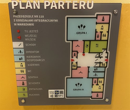 W skład realizacji w Przedszkolu nr 118 z Oddziałami Integracyjnymi w Warszawie wchodzą: dotykowy plan informacyjny obiektu ze znacznikami YourWay Beacon i NFC, i metalowe, brajlowskie tabliczki informacyjne. Dotykowy plan informacyjny placówki ma postać wielobarwnej tablicy z tworzywa PMMA, umieszczonej w pionie, na ścianie, na dystansach. Plan opatrzony jest wspomnianymi wyżej znacznikami YourWay Beacon i NFC, a także legendą w brajlu i w czarnym druku. Realizacja obejmuje ponadto brajlowskie, metalowe tabliczki informacyjne.