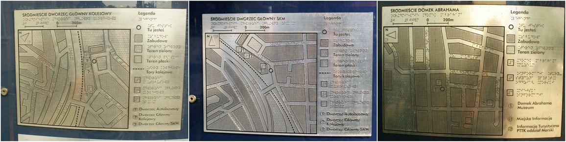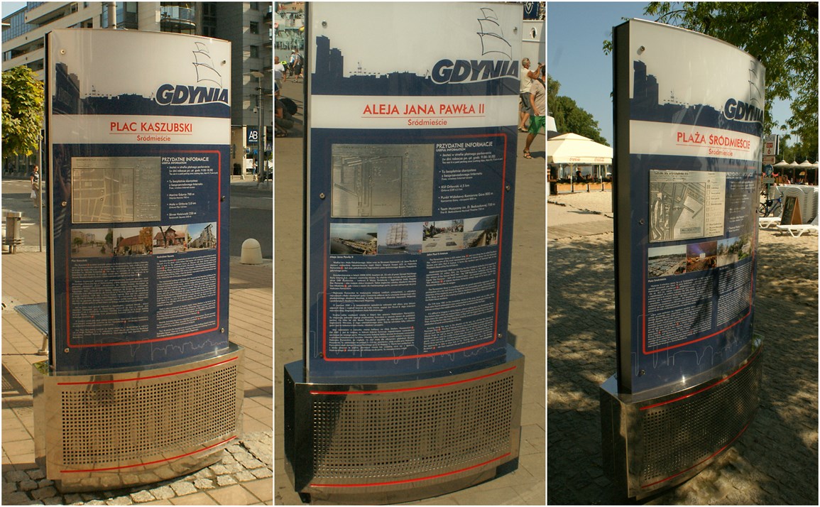 Realizacja obejmuje plany informacyjne przestrzeni miejskiej Gdyni. Mają postać dużych, estetycznych tablic, umieszczonych w pionie. Znajdują się na ramowych, stalowych stojakach, posadowionych na perforowanych postumentach z chromowanej stali. Tablice utrzymane są w granatowo-biało-oliwkowo-czerwonej kolorystyce. Zawierają szczegółowe opisy miejsc, w których zostały usytuowane, a więc np. Plaża Śródmieście, Plac Kaszubski czy Aleja Jana Pawła II. Opisy są zarówno w czarnym druku, jak i w brajlu.