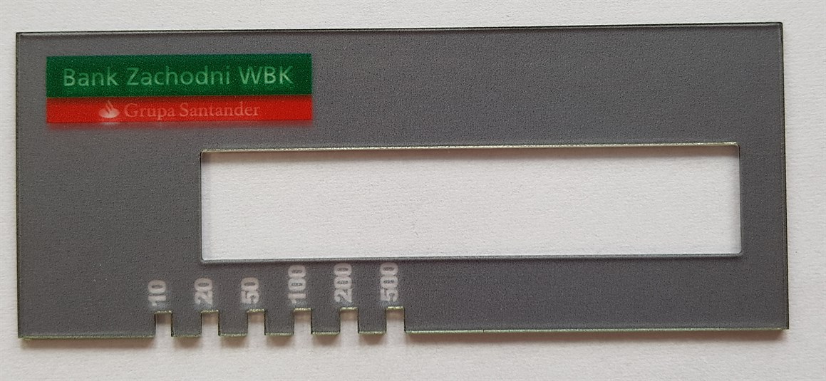 Dla Banku Zachodniego WBK wykonano estetyczną tabliczkę, szablon z tworzywa przeznaczony do precyzyjnego składania podpisów. Kolorystyka tabliczki to grafit, biel i czerń, a także zieleń charakterystyczna dla Banku Zachodniego i czerwień znajdująca się w logo Grupy Santander, do której należy WBK.