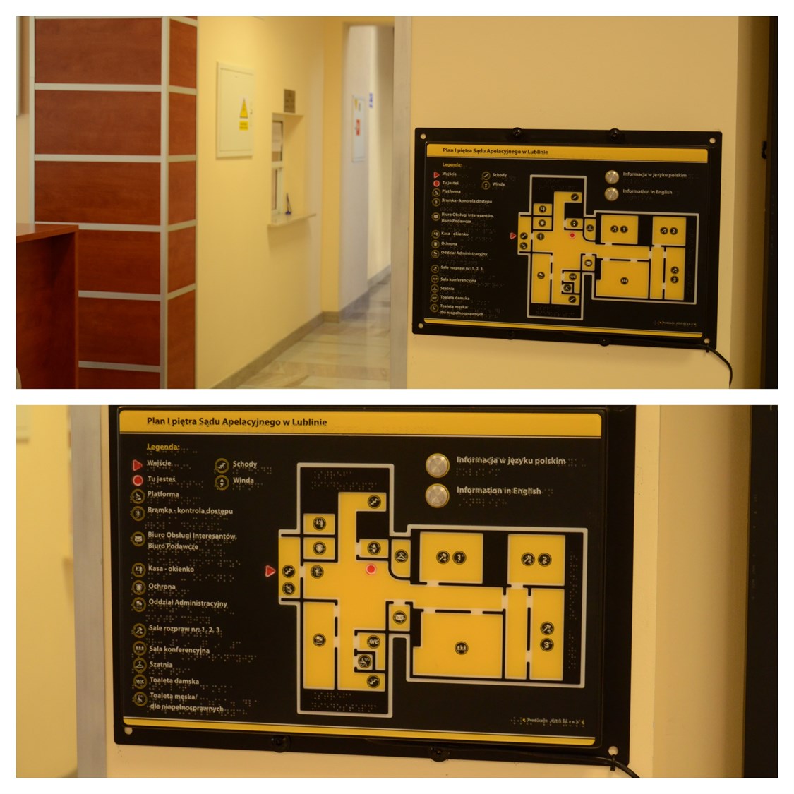Dotykowy plan Sądu Apelacyjnego w Lublinie, a ściślej jego pierwszego piętra, ma postać wielobarwnej tablicy z wypukłymi elementami, wykonanej w całości z tworzywa PMMA, zwanego szkłem organicznym, odpornego na warunki atmosferyczne, zadrapania i uszkodzenia. Tablica umieszczona jest na wprost wejścia, po lewej stronie, na ścianie, na wysokości około 130 centymetrów od posadzki. Tablica usytuowana jest pionowo. Plan obiektu znajduje się w prawej i centralnej części tablicy. Tuż nad nim umieszczono na tablicy dwa metalowe przyciski – górny z informacją po polsku na temat rozkładu pomieszczeń, dolny, z taką samą informacją po angielsku. W lewej części tablicy znajduje się legenda planu w brajlu i w czarnym druku. Realizacja obejmuje ponadto metalowe tabliczki na drzwi z napisami w brajlu. Sąd Apelacyjny jest na liście obiektów aplikacji YourWay, ale tablica informacyjna z dotykowym planem nie jest wyposażona w beacon.
