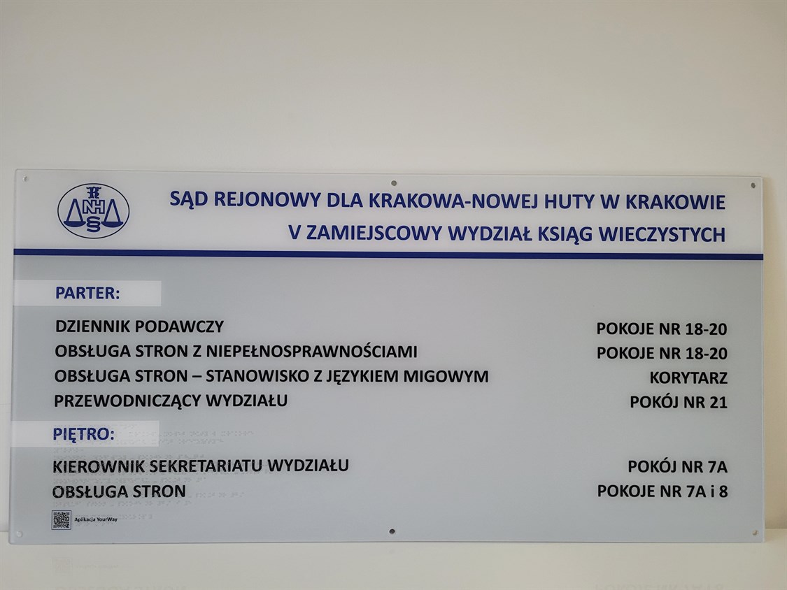Dla Sądu Rejonowego Kraków Nowa Huta V Wydziału Zamiejscowego Ksiąg Wieczystych zostały wykonane dwie identyczne tablice informacyjne z PMMA z napisami w czarnym druku i w brajlu. Tablice zostały wyposażone w znaczniki YorWay Beacon i zamontowane w pionie, na ścianach. Utrzymane są w biało-granatowo-czarnej kolorystyce. Smartfon z aplikacją Your Way, po skomunikowaniu się ze znacznikiem YourWay Beacon, poinformuje syntetycznym głosem o treści tablic.