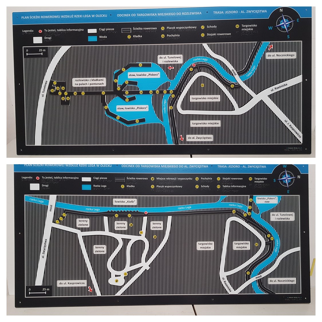 Realizacja obejmuje pięć dotykowych planów informacyjnych kilku odcinków ścieżki rowerowej wzdłuż rzeki Lega w Olecku. Mają one postać czarno-niebiesko-białych tablic z drobnymi, żółtymi i czerwonymi elementami, a także z czarnodrukowymi i brajlowskimi napisami. Wykonane są w całości z tworzywa PMMA, zwanego szkłem organicznym, odpornego na warunki atmosferyczne, zadrapania i uszkodzenia. Tablice znajdą swoje miejsce przy właściwych odcinkach ścieżki rowerowej, w perspektywie zależnej od tego, gdzie będą umieszczone. Plany informacyjne usytuowane są centralnie, zaś legendy znajdują się w górnej części każdej z tablic. W prawym, górnym rogu tablic znajduje się róża wiatrów.