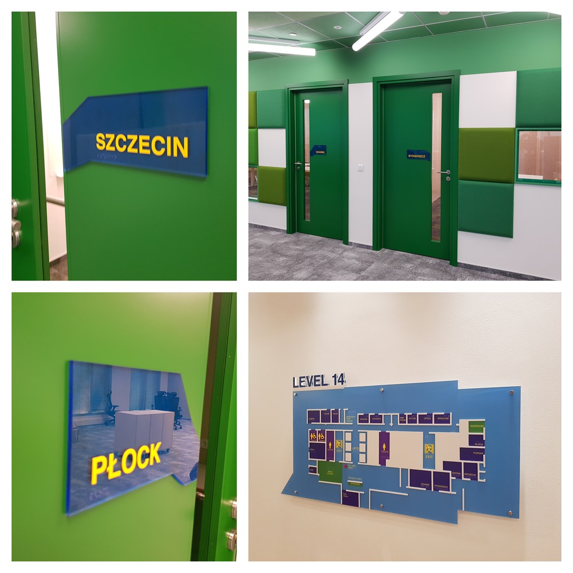 Dotykowe plany warszawskiej siedziby firmy Google mają postać wielobarwnych tablic z wypukłymi elementami, wykonanych w całości z tworzywa PMMA, zwanego szkłem organicznym, odpornego na warunki atmosferyczne, zadrapania i uszkodzenia. Umieszczone są na każdym z pięter zajmowanych przez Google, w każdym z dwóch skrzydeł piętra, od wind na lewo i na prawo, na ścianach. Tablice usytuowane są pionowo, na wysokości wygodnej do oglądania. Plan każdego z pięter znajduje się w centralnej części tablicy i jest opisany w brajlu, z czarnodrukowym poddrukiem. Realizacja obejmuje ponadto tabliczki informacyjne na drzwi i ściany, wykonane z PMMA, z wypukłymi literami czarnodrukowymi i brajlowskimi, przyklejane samoprzylepną taśmą. Na jednym tylko piętrze 14 jest ich około 40.