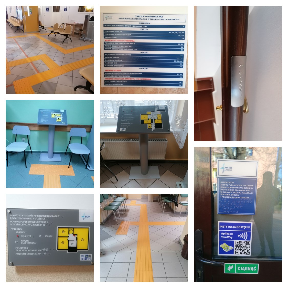 Realizacja tyflograficzna w SPZOZ Oleśnica została wykonana w czterech placówkach zespołu – w dwóch przychodniach w Oleśnicy, a także w przychodniach w Ligocie Polskiej i w Boguszycach. W skład realizacji wchodzą dotykowe plany informacyjne ze znacznikami YourWay Plus i NFC, pętle indukcyjne dla osób słabosłyszących, brajlowskie i czarnodrukowe tablice i tabliczki informacyjne na ściany i drzwi, brajlowskie nakładki na poręcze schodów, linie naprowadzające i pola uwagi. Dotykowe plany informacyjne mają postać tablic utrzymanych w pastelowej kolorystyce – błękit, biel, szarość, żółty i dodatek czerni. Plany opatrzone są legendami w czarnym druku i w brajlu. Część tablic usytuowano na ergonomicznie pochylonych stojakach ze stali malowanej proszkowo, część znajduje się na ścianach, na dystansach, w pionie. Tablice i tabliczki informacyjne w czarnym druku i w brajlu umieszczono na ścianach lub na drzwiach. Utrzymane są w biało-niebieskiej kolorystyce. Dopełnieniem realizacji są pętle indukcyjne wzmacniające dźwięk i ułatwiające komunikację z osobami niedosłyszącymi. Przychodnie zostały ponadto wyposażone w kontrastowe linie naprowadzające i pola uwagi. Wszystkie te elementy są w ostrym kolorze żółtym.