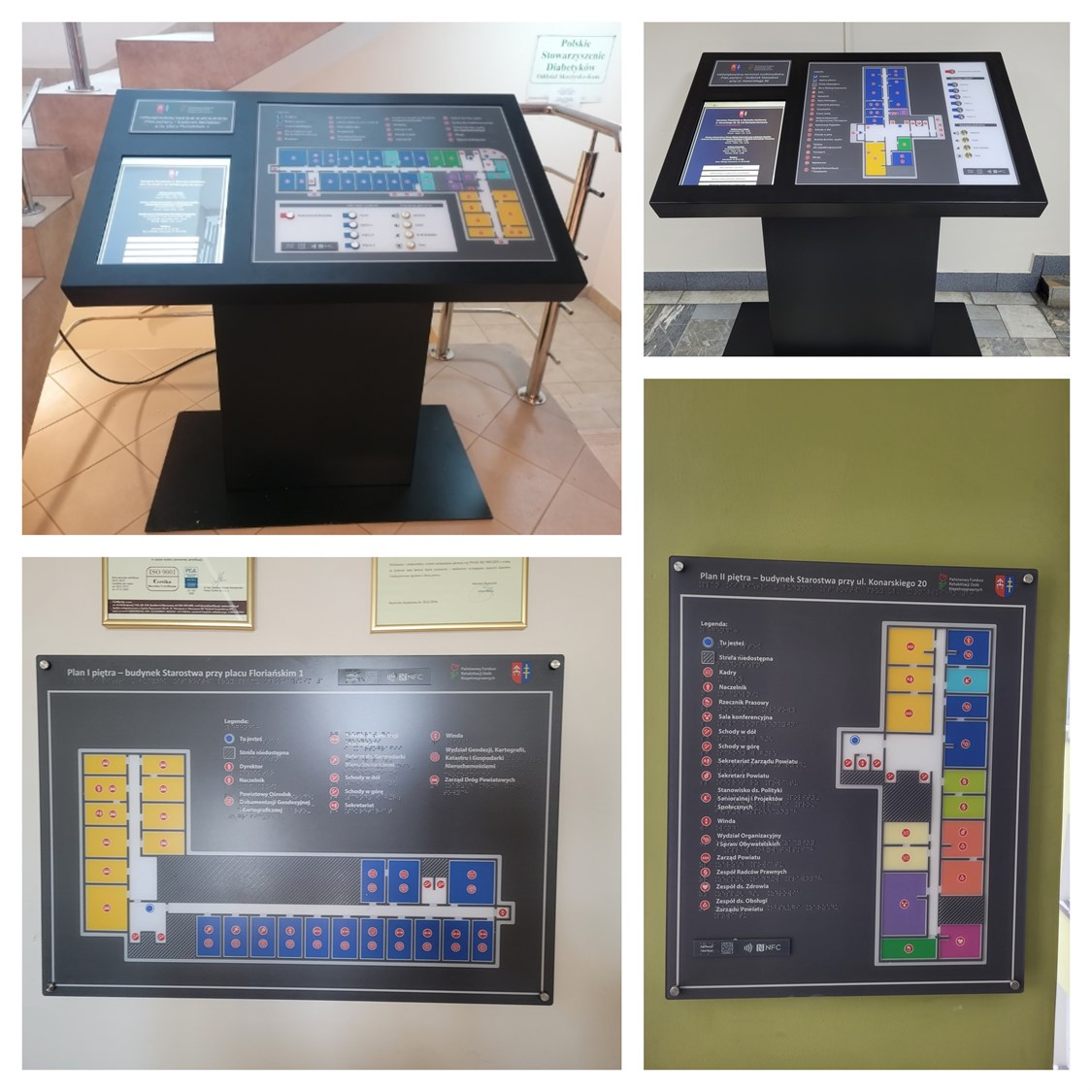 W skład realizacji wykonanej w Starostwie Powiatowym w Skarżysku-Kamiennej wchodzą dwa udźwiękowione terminale multimedialne i osiem dotykowych planów informacyjnych ze znacznikami YourWay Plus i NFC w obu budynkach starostwa przy ulicy Konarskiego 20 i przy Placu Floriańskim 1. W udźwiękowione terminale multimedialne wbudowana jest aplikacja infokiosk z opisami pomieszczeń i z planami poszczególnych pomieszczeń wraz z ich opisem. Terminale utrzymane są wielobarwnej kolorystyce na grafitowym tle. Masywne stojaki, ergonomicznie pochylone, wykonane są ze stali malowanej proszkowo na kolor czarny. Terminale zawierają dotykowe plany informacyjne obiektu z legendami w czarnym druku i w brajlu, a także z metalowymi przyciskami, po których wciśnięciu można usłyszeć głosowe komunikaty na temat wybranego na planie elementu, odpowiadającego realnemu wydziałowi starostwa. Dotykowe plany informacyjne mają postać tablic z tworzywa PMMA. Utrzymane są w kolorystyce podobnej do tej, która charakteryzuje terminale multimedialne. Plany zostały umieszczone w pionie, na ścianach, na dystansach. Zawierają legendy w czarnym druku i w brajlu i są wyposażone we wspomniane już znaczniki YourWay Plus i NFC.