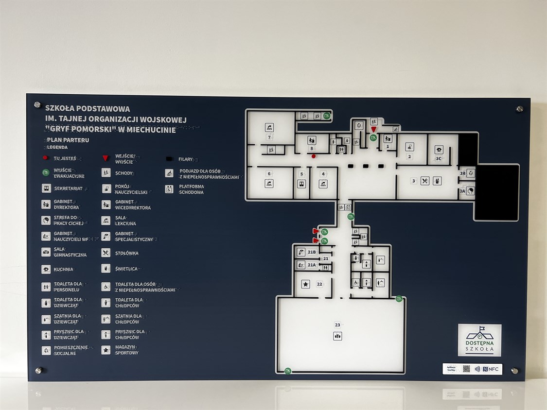 Dla Szkoły podstawowej im. mjr Henryka Sucharskiego w Chmielnie i dla Szkoły podstawowej im. Tajnej Organizacji Wojskowej „Gryf Pomorski” w Michucinie wykonanych zostało pięć dotykowych planów informacyjnych i sto tabliczek w czarnym druku i w brajlu z piktogramami.
