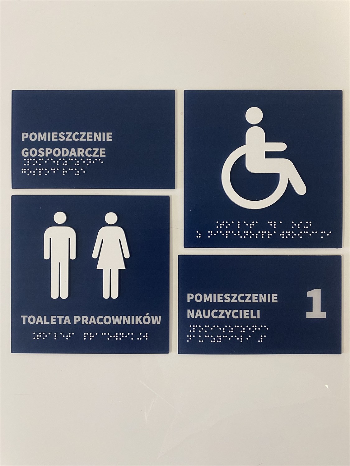 Jednolita jest także kolorystyka tabliczek informacyjnych. To granat i biel. Granatowe jest tło, białe napisy w czarnym druku, w brajlu i białe piktogramy.