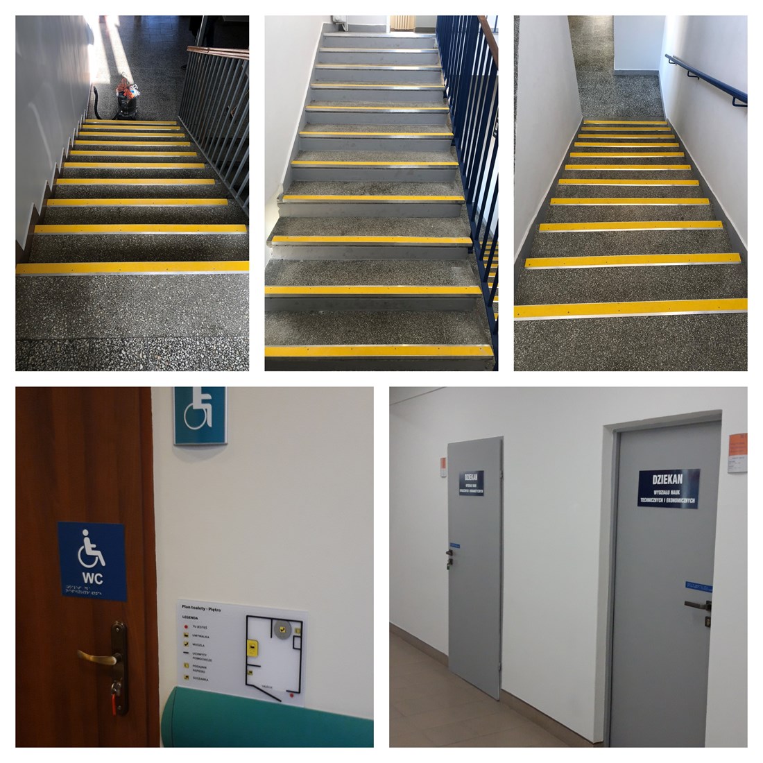 W budynku Uczelni Zawodowej w Tarnobrzegu wykonane zostały tabliczki informacyjne na drzwi, nakładki na schody i plan informacyjny toalety. Tabliczki informacyjne PMMA na drzwi zawierają napisy w brajlu oraz informacje wizualne, np. oznakowanie toalet. Informacyjny, dotykowy plan toalety usytuowany jest w pionie, na ścianie. Utrzymany jest w biało-czarnej kolorystyce z żółtymi i czerwonymi elementami. W skład realizacji wchodzą ponadto antypoślizgowe nakładki na schody.