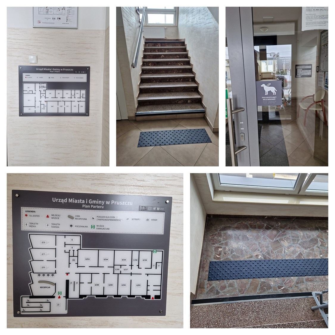 W skład realizacji wykonanej w Urzędzie Miasta i Gminy w Pruszczu wchodzą trzy dotykowe plany informacyjne ze znacznikami YourWay Beacon i NFC, 11 tabliczek informacyjnych w czarnym druku i w brajlu ze znacznikami NFC, pola uwagi przed schodami i recepcją oraz nakładki, kątowniki, na krawędzie schodów.