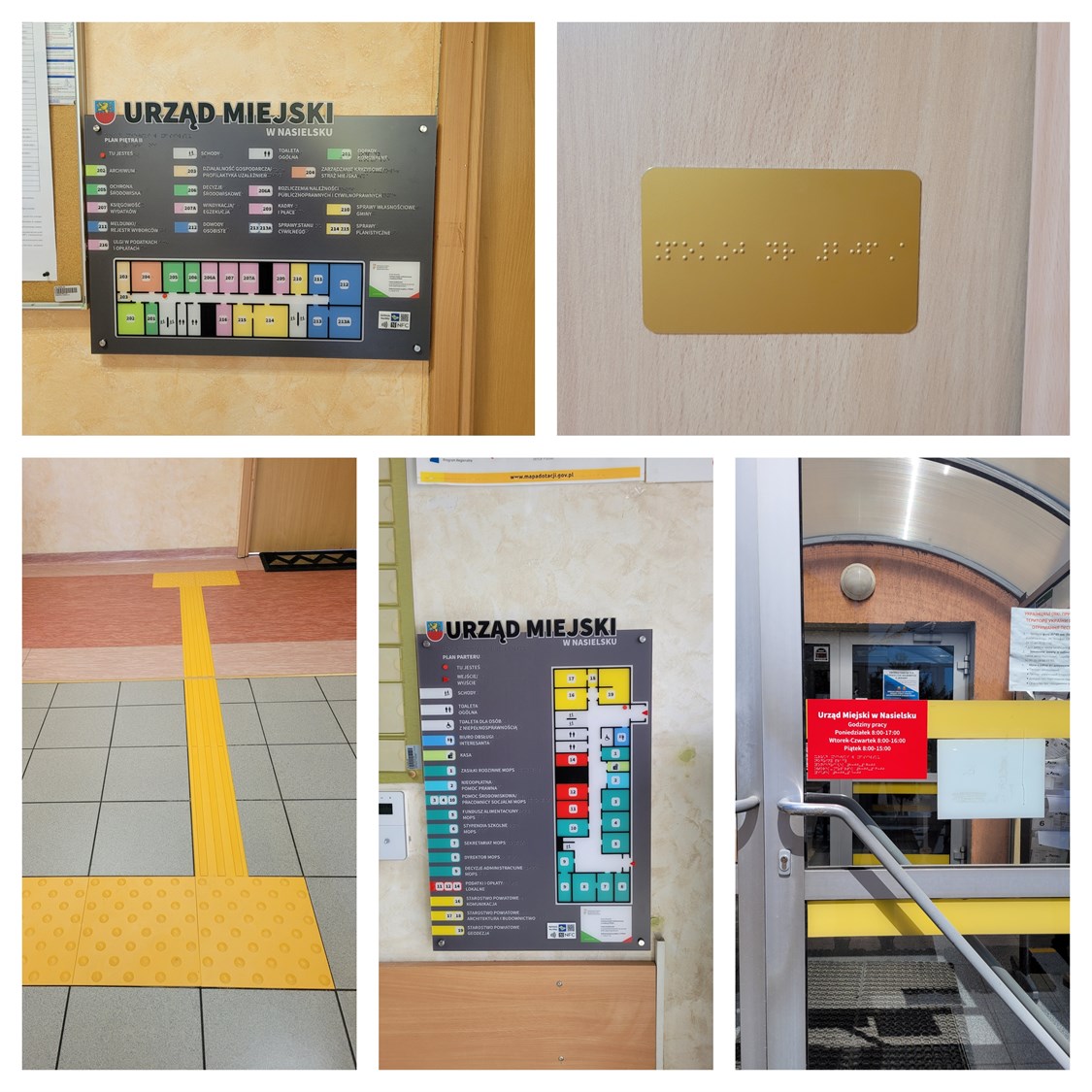 W budynku Urzędu Miasta Nasielsk została w wykonana realizacja tyflograficzna obejmująca trzy dotykowe plany informacyjne wyposażone w znaczniki YourWay Beacon i NFC, 55 brajlowskich, aluminiowych tabliczek informacyjnych, tabliczkę informacyjną z grawerem i brajlem na drzwi wejściowe, linie naprowadzające i pola uwagi, pasy ostrzegawcze na krawędzie schodów. Dotykowe plany informacyjne mają postać wielobarwnych tablic z tworzywa PMMA i opatrzone są legendami w brajlu, i czarnym druku, a także wyposażone we wspomniane już znaczniki komunikujące się z aplikacją YourWay na smartfonie osoby odwiedzającej urząd. Wszystkie plany zostały umieszczone w pionie, na ścianach, na dystansach. Brajlowskie, aluminiowe tabliczki informacyjne zamontowane są na drzwiach. Linie naprowadzające i pola uwagi mają kontrastową, żółtą barwę. Żółte są też pasy ostrzegawcze na krawędziach schodów. Tabliczka informacyjna na drzwi wejściowe z grawerem, czarnym drukiem i brajlem jest barwy czerwonej.