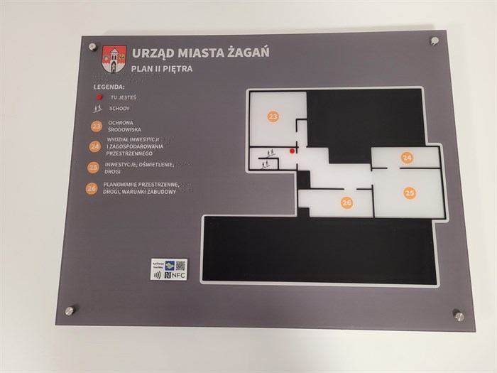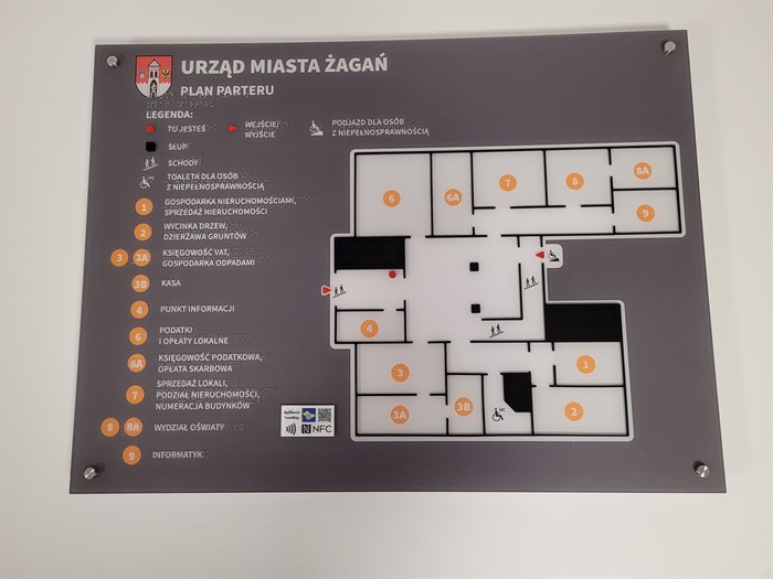 Dotykowe plany informacyjne opisują topografię parteru, pierwszego piętra i drugiego piętra budynku. Wszystkie utrzymane są w jednolitej kolorystyce. Na grafitowym tle znajdują się białe, czarne i pomarańczowe elementy. Tablice z planami wykonane są z tworzywa PMMA i zamontowane w pionie, na ścianach, na dystansach. Legendy zostały opisane w czarnym druku i w brajlu. Wszystkie plany są wyposażone w znaczniki YourWay Beacon i NFC.