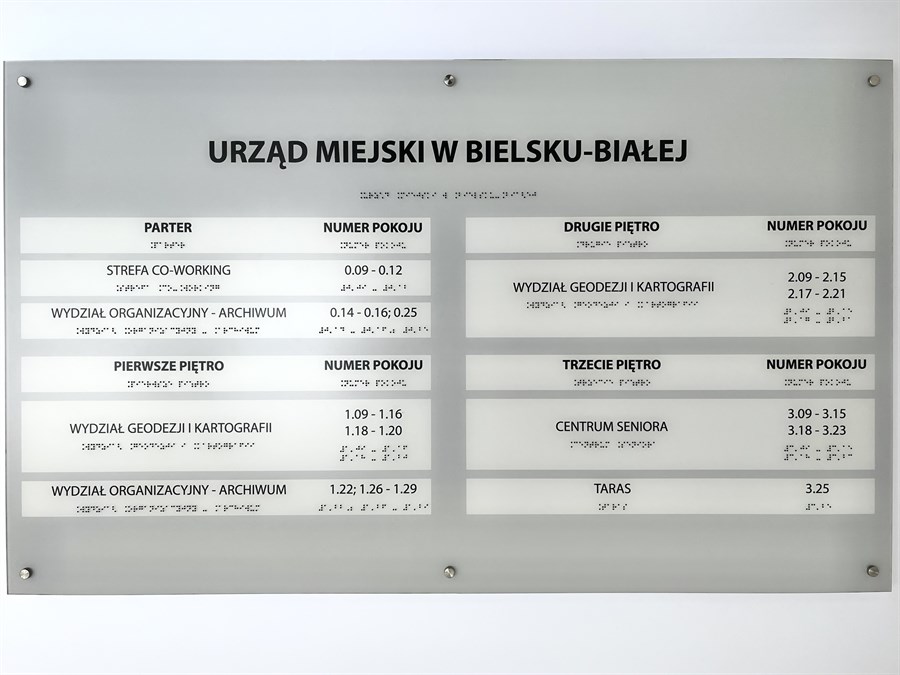 Dla Urzędu Miejskiego w Bielsku-Białej wykonano tablicę informacyjną z tworzywa PMMA. Utrzymana jest w biało-szaro-czarnej kolorystyce. Znajdują się na niej czarnodrukowe i brajlowskie nazwy i numery pięter, nazwy wszystkich wydziałów urzędu i numery pokoi, które zajmują. Tablica umieszczona jest na ścianie, na dystansach.