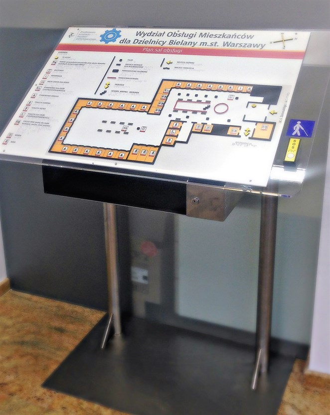 Wydział Obsługi Mieszkańców Urzędu Dzielnicy Bielany m.st. Warszawy został wyposażony w dotykowy plan informacyjny i w system Call-Hear. Dotykowy, wypukły plan informacyjny wydziału ma postać ergonomicznie pochylonej tablicy umieszczonej na stojaku z chromowanej stali. Plan utrzymany jest w kolorystyce, gdzie przeważa biel, czerń, brąz i kolor pomarańczowy. Obok planu znajduje się czarnodrukowa i brajlowska legenda z dotykowymi elementami. Istotną składową realizacji jest Call-Hear, system wzywania pomocy, przeznaczony dla osób niepełnosprawnych. Informuje, że w budynku lub przed wejściem doń znajduje się osoba potrzebująca asysty, np. osoba niewidoma. Tym samym system ułatwia dostęp do obiektu każdemu, kto ma trudności w samodzielnym poruszaniu się. Ponadto, zamontowany w newralgicznych miejscach, umożliwia błyskawiczną reakcję w sytuacjach nagłych i awaryjnych. System składa się z jednostki alarmującej - nadajnika, odbiornika wewnętrznego i opcjonalnie z klucza lub zestawu kluczy, które służą do aktywacji nadajnika. Jednostka alarmująca, bezprzewodowy nadajnik, montowany jest na zewnątrz budynku, najczęściej przy drzwiach wejściowych. Można go także zamontować w recepcji, w punkcie obsługi klienta itp. Jednostka alarmująca, nadajnik, aktywowany jest po naciśnięciu przycisku, lub przy pomocy klucza, jeśli wybrano wersję urządzenia z kluczem. Po aktywowaniu nadajnik wysyła sygnał do odbiornika wewnętrznego. Może to być dźwięk, migające światła lub oba te sygnały jednocześnie. Sygnały stanowią informację dla recepcji lub punktu obsługi klienta, że przy wejściu oczekuje osoba potrzebująca pomocy.