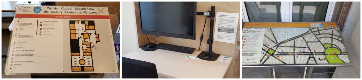 Urząd Dzielnicy Ochota m.st. Warszawy został wyposażony w dwa dotykowe plany informacyjne i w stanowisko komputerowe dostosowane do potrzeb osób słabowidzących. Wielobarwny, dotykowy, wypukły plan informacyjny okolic urzędu ma postać ergonomicznie pochylonej tablicy umieszczonej na dwunożnym stojaku z chromowanej stali. Ów plan znajduje się z prawej strony tablicy i jest przesunięty ku części centralnej, w jej lewej części znajduje się legenda w czarnym druku i w brajlu. Wewnątrz budynku, na postumencie z chromowanej stali, usytuowany jest plan Wydziału Obsługi Mieszkańców. Ergonomicznie pochylony, utrzymany jest w kolorystyce, gdzie przeważa biel, czerń, brąz i kolor pomarańczowy. Obok planu znajduje się czarnodrukowa i brajlowska legenda z dotykowymi elementami. W sali Wydziału Obsługi Mieszkańców znajduje się ponadto stanowisko komputerowe dostosowane do potrzeb osób słabowidzących. Można tu uzyskać informacje dotyczące spraw załatwianych w urzędzie.