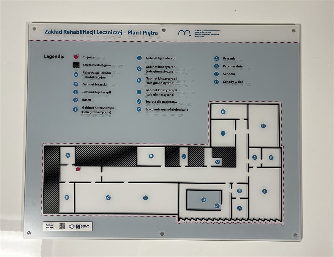 W Zakładzie Rehabilitacji Leczniczej w Górnośląskim Centrum Medycznym im. prof. Leszka Gieca w Katowicach wykonany został dotykowy plan informacyjny ze znacznikami YourWay Beacon i NFC. Plan w postaci tablicy z tworzywa PMMA został umieszczony na ścianie, na dystansach. Utrzymany jest w stonowanych barwach – szarość, błękit, czerń i biel. Zawiera dokładną legendę w czarnym druku i w brajlu. Oba znaczniki umieszczone są na tablicy z planem.