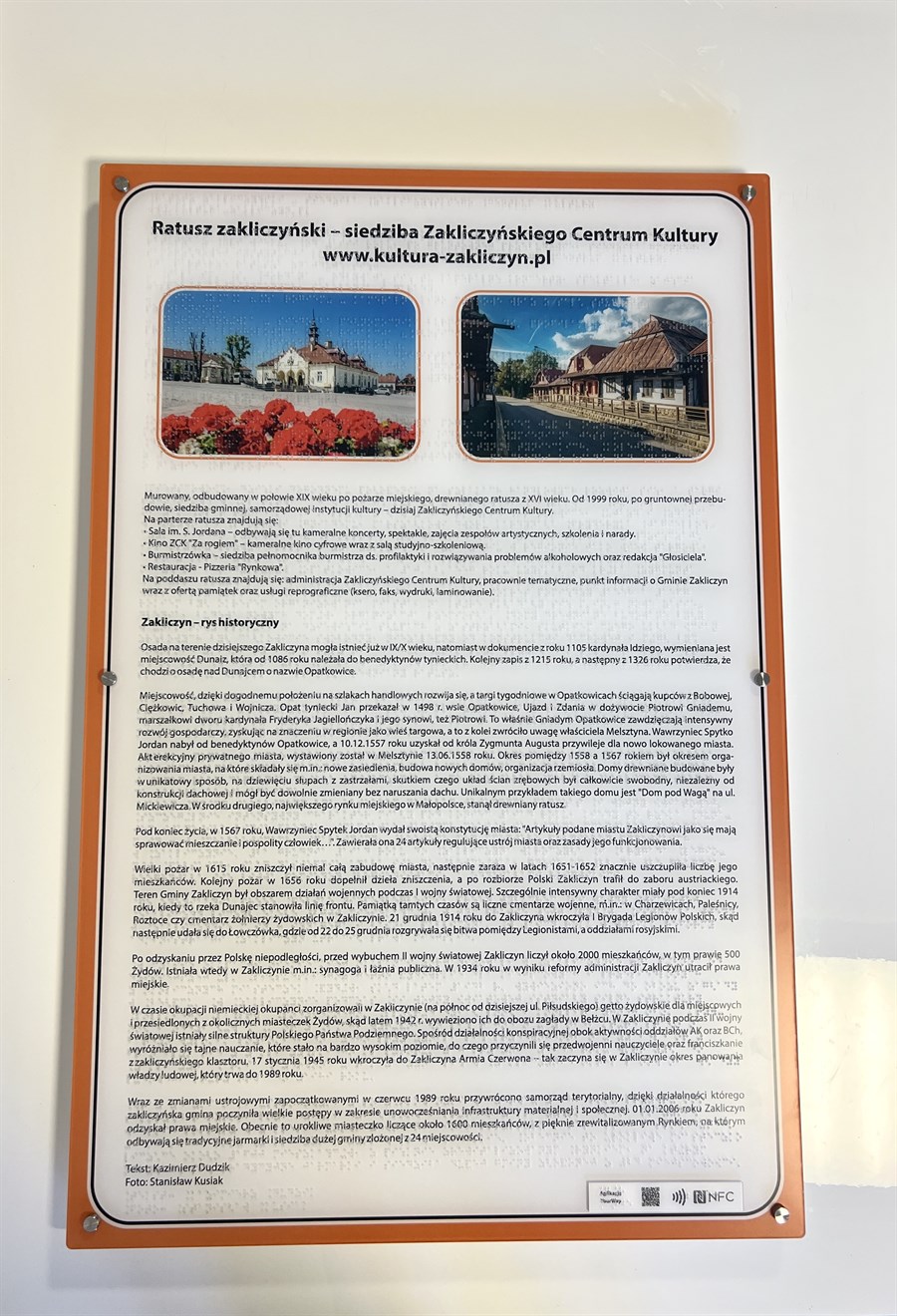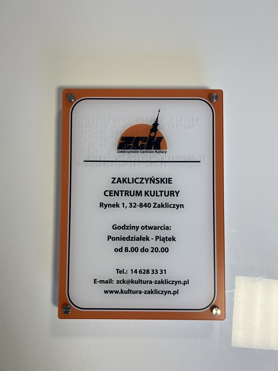 W Zakliczyńskim Centrum Kultury wykonano tablicę informacyjną ze znacznikami YourWay Beacon i NFC, z rycinami i z opisem w czarnym druku i w brajlu, zawierającym rys historyczny budynku, nieco mniejszą tablicę w czarnym druku i w brajlu zawierającą dane adresowe i godziny otwarcia placówki, a także 21 tabliczek czarnodrukowo-brajlowskich opisujących poszczególne sale, pokoje i toalety.