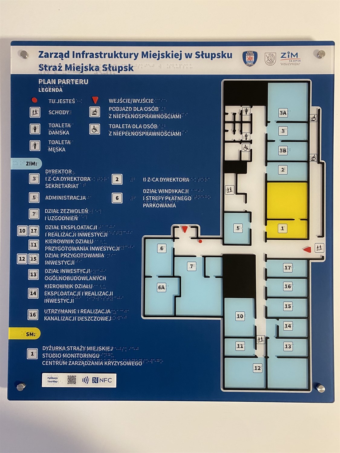 Realizacja w siedzibie Zarządu Infrastruktury Miejskiej w Słupsku obejmowała wykonanie dwóch dotykowych planów informacyjnych, metalowych tabliczek informacyjnych w brajlu i kątowników na schody.