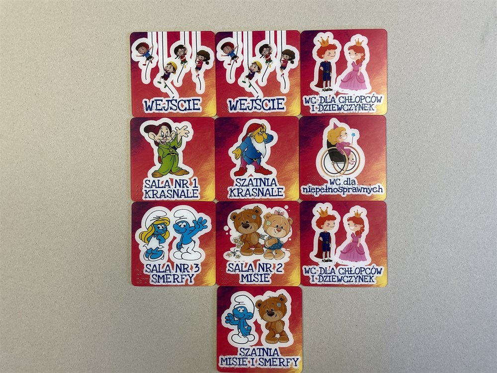 Realizacja obejmuje 10 sztuk brajlowskich i czarnodrukowych tabliczek informacyjnych wykonanych z tworzywa PMMA i zamontowanych w przedszkolu Zespołu Szkolno – Przedszkolnego w Koszarawie. Tabliczki zawierają kolorowe obrazki utrzymane w bajkowej konwencji oraz czarnodrukowe i brajlowskie napisy informujące o miejscu, w którym zostały umieszczone.